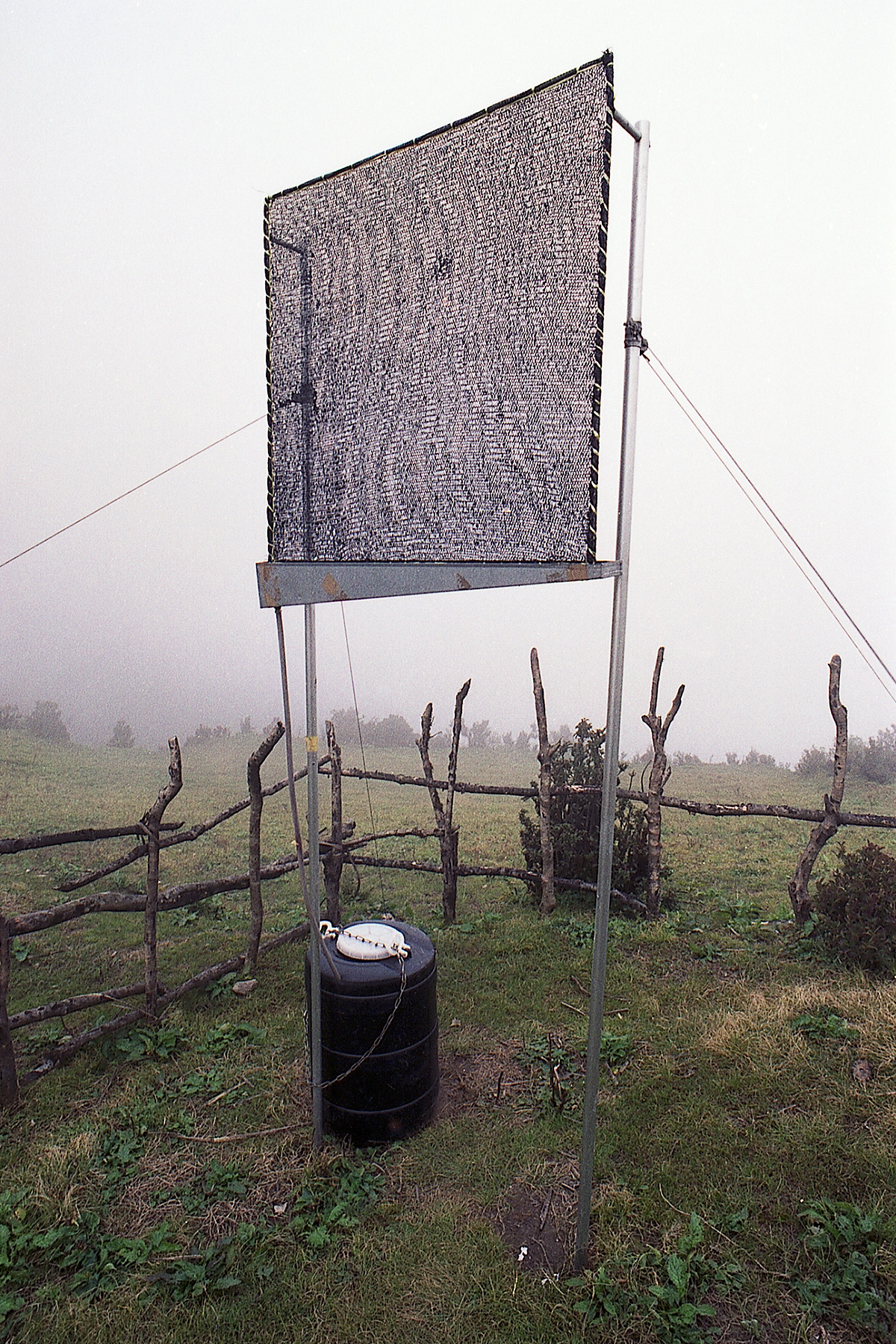 A fog collector, a structure resembling a large volleyball net, is constructed of polypropylene mesh that is suspended between two upright supports. It collects clean water from the thick mountain fog and channels it into storage tanks, which the community then accesses through an outdoor tap.